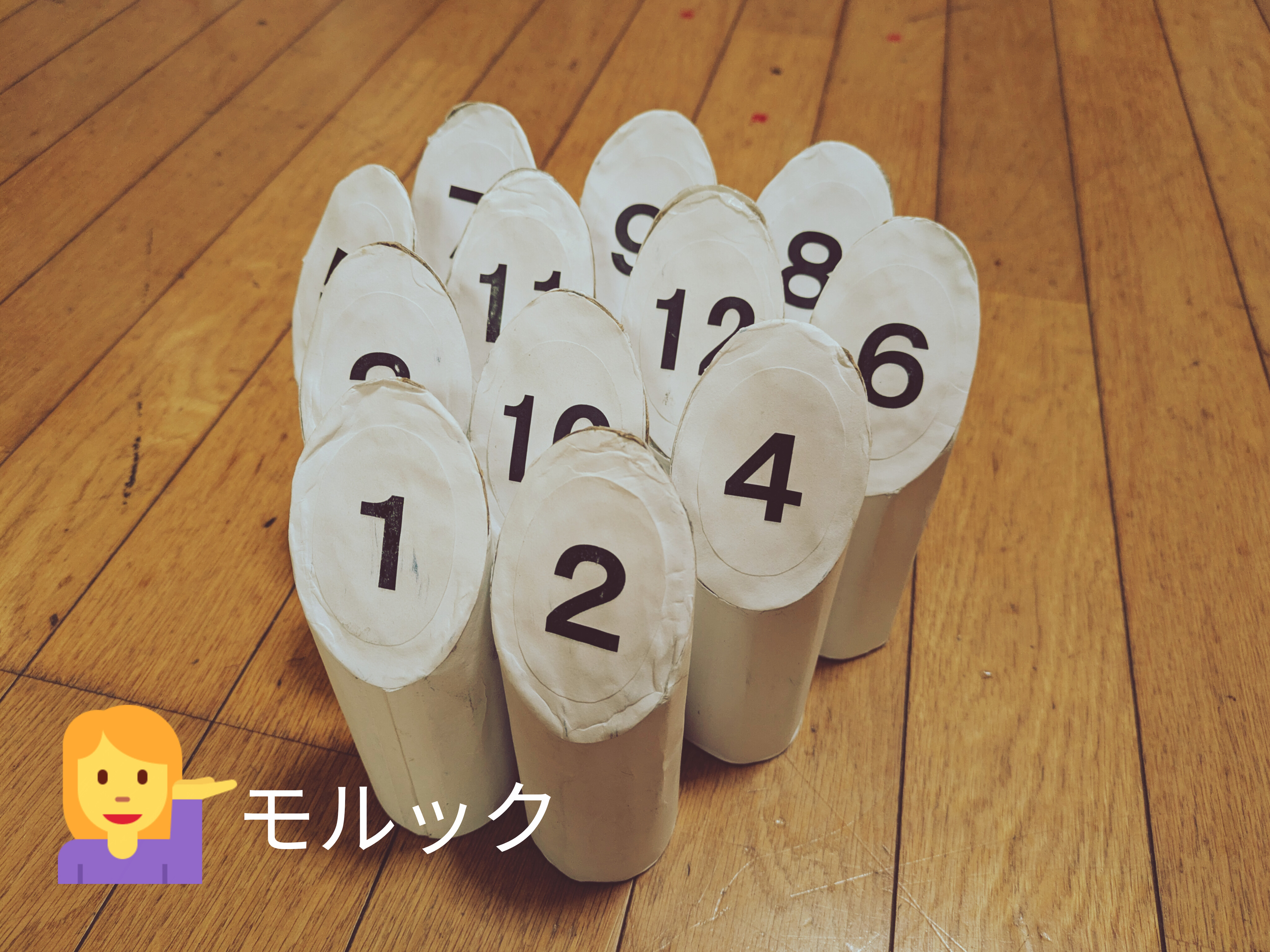 ルールはシンプル 通常を少し変えてオリジナルに☆1〜12まての数字を書いたスキットルを並べモルック棒を投げていきます。1度目は倒れた本数が得点になり、2回目は倒れた場所そのままにスキットルを起こして始まります。