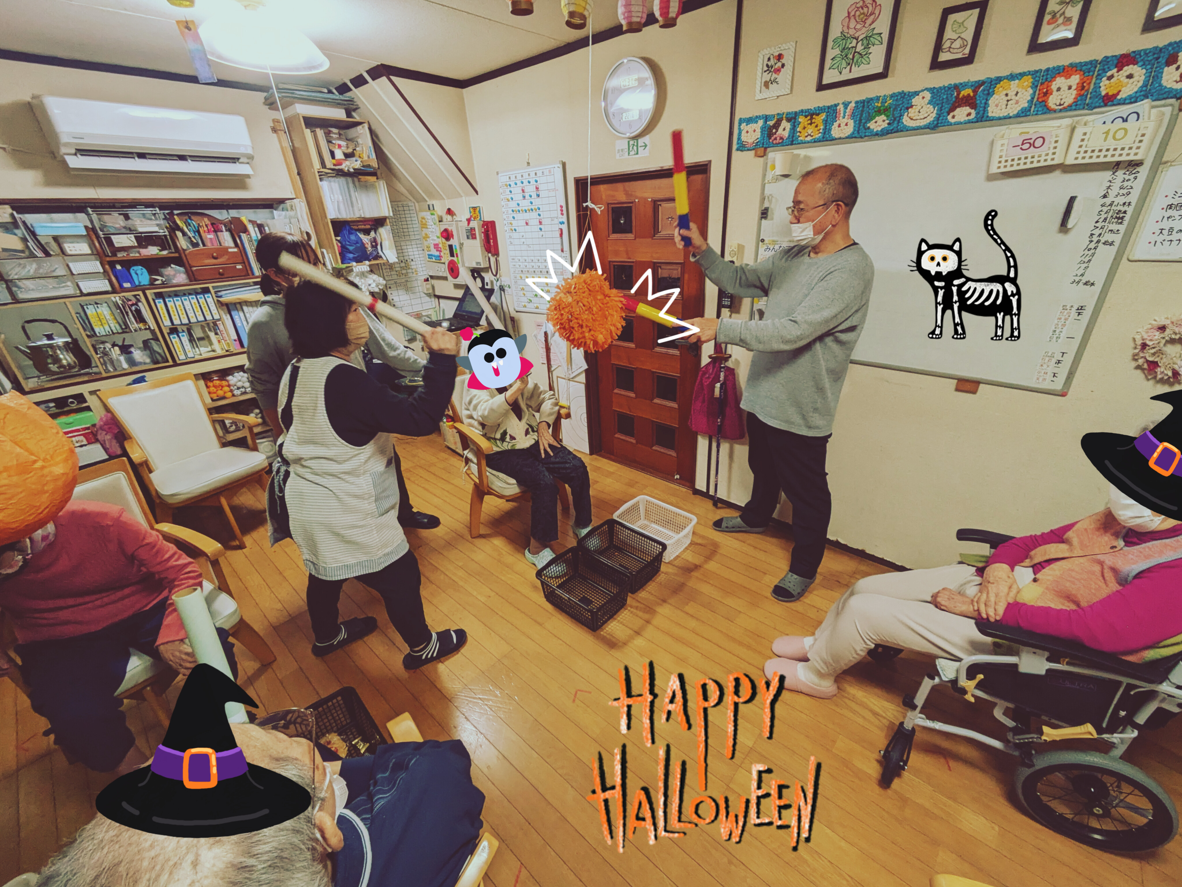 HappyHalloween!の声とともに容赦なくピニャータを叩くY子さんF雄さん、可愛く作れてるのに叩けないわぁ〜と遠慮気味のT子さん。